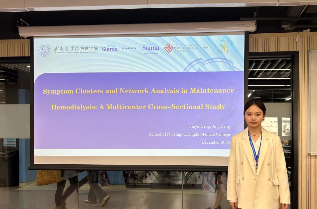本次会议汇聚了来自中国、新加坡等19个国家和地区的550余名护理管理者、临床专家、教育者与研究人员,共同探讨数字健康与人工智能在临床护理、社区卫生、公共卫生及护理教育等领域的创新应用。护理学院师生积极参与主会场与分会场研讨,围绕数字健康平台建设、人工智能辅助决策、智慧护理教育等前沿议题展开交流。在“Empowering and Engaging Patients through Digital Health Innovations”分会场,2024级护理硕士研究生邓佳钰作题为“Symptom Clusters and Network Analysis in Maintenance Hemodialysis: A Multicenter Cross-Sectional Study”的口头报告,展示了学院在症状管理与数据分析方面的研究成果,获得与会专家好评。