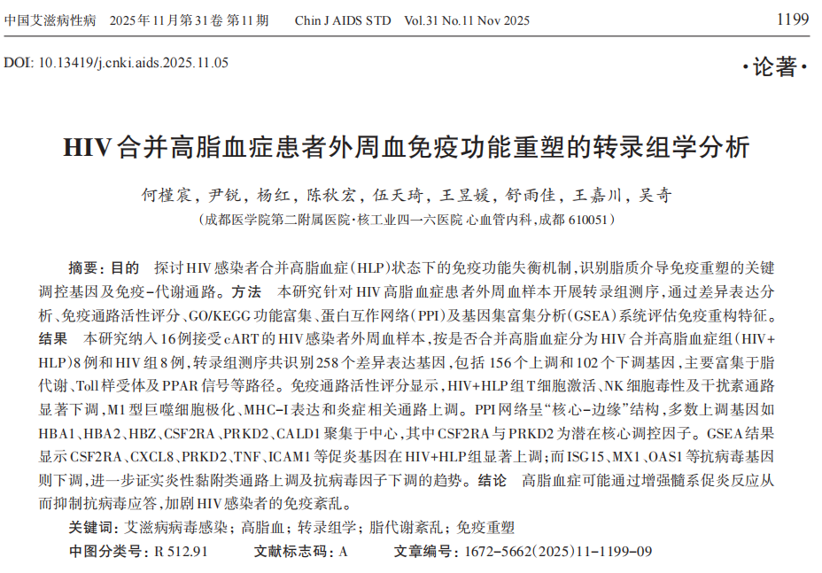 近日,附二院心血管内科团队研究成果《HIV合并高脂血症患者外周血免疫功能重塑的转录组学分析》,发表于中文北大核心期刊《中国艾滋病性病》(2025年11月第31卷第11期)。该研究通过转录组测序发现,高血脂在HIV感染者体内会激活炎症通路并抑制抗病毒免疫应答,加剧免疫系统紊乱,从而加速动脉粥样硬化进程。
