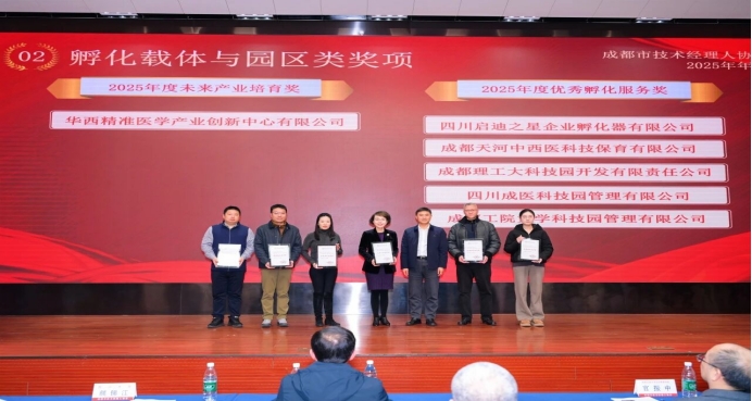 大会期间,协会对在2025年度表现突出的单位与个人予以表彰。其中,四川成医科技园管理有限公司凭借在科技成果转化与创新创业服务方面的突出贡献,获评“2025年度优秀孵化服务奖”。