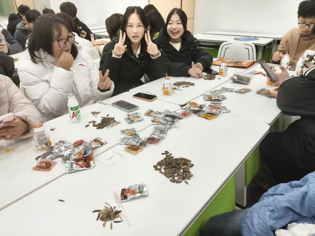 自由游戏环节,教室化身为多元的娱乐空间。东侧桌边,一场“狼人杀”正紧张进行,同学们眉头紧锁、仔细推理;西侧扑克牌区传来阵阵欢笑;中央长桌上,“三国杀”战局激烈,谋略与运气交织。饮料和零食在同学们手中传递,轻松自然的对话在小组间流淌。“你这个技能用得真好!”“下次我们可以一起组队!”