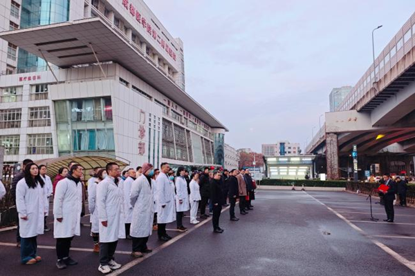 天色初晓,晨光微露,医院领导班子、各党支部职工代表60余人已整齐列队、精神昂扬,共同迎接2026年第一个工作日的第一缕曙光。