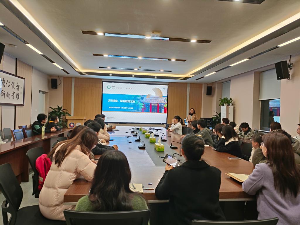 任雁娟围绕春季心理调适主题展开三层深度分享。首先从科学视角剖析春季光照变化、体内激素分泌对大脑的影响,清晰解读春困形成的生理机制,让学子们理解春季身体状态波动的底层原因。随后以“觉察情绪”的互动小游戏为载体,引导同学们在趣味中识别和命名自己当下的情绪状态,从而更直观地理解情绪的多样性与合理性。最后针对春季身心困扰,分享了一系列可落地的调适策略,从作息调整、饮食搭配等缓解春困的方法,到情绪疏导、压力释放的心理调节技巧,为学子们应对学业挑战、保持稳定心态提供了具体可行的建议。肖湉则与学弟学妹们进行了一场干货满满的分享交流会。她结合自身经历,分享了在实习与考研过程中遇到的挑战、收获的感动以及如何进行备考及心理调适的宝贵经验。