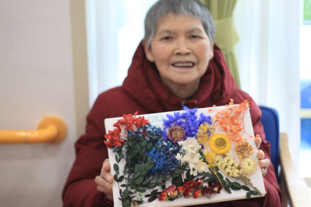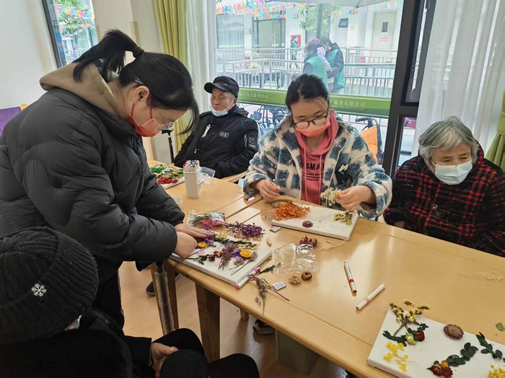 志愿者通过简单易懂的讲解,向老人们介绍了干花的特性、干花画的创作技巧、注意事项,用提前准备的干花画作品展示,帮助老人们构思创作灵感,告诉大家“艺术源于生活,无需追求完美,随心搭配就是最好的作品”,鼓励老人们大胆创意。老人们兴致高昂,小心翼翼地挑选干花素材,认真搭配构图,发挥对晚年生活的美好想象,努力用干枯却依旧明艳的花草在画纸上缓缓勾勒出独一无二的图案。志愿者们则陪在身旁,一边协助干花画的胶粘,一边倾听老人讲述过去的平凡故事,轻声回应着岁月沉淀的智慧与温情,在一片欢声笑语中一件件让人喜爱的干花画作悄然绽放。当老人们举着自己的作品,开心和快乐写满脸庞,幸福在这一刻变得无比具象,也让现场每个志愿者内心感到非常温暖。