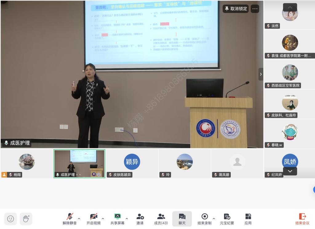 公开课以“管理沟通与冲突”为主题,王辉教授通过情景模拟、案例分析、文化浸润等多元教学方法,将“阑尾炎术后患者发热”“老年患者护理”等临床情境融入课堂,生动拆解沟通原则与非语言关怀要点,并以“聽”字为文化切入点,阐释倾听的艺术,引导学生理解“听懂患者背后的诉求”才是化解冲突的核心。互动环节中,王辉教授围绕职业引导、护患沟通、临床安全教育等问题,与线上线下教师展开深入交流。