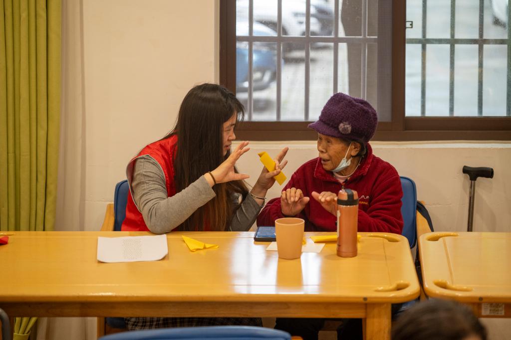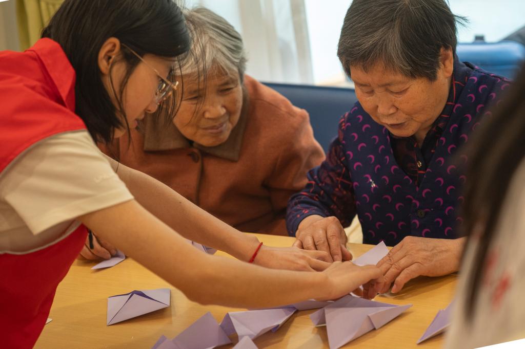 当日上午,团队前往新都区新渡街道社区养老服务综合体。志愿者们以《外婆的澎湖湾》《歌唱祖国》等合唱开场,带动老人们跟唱、拍手。随后,志愿者带领老人们开展折纸活动,并送上手写祝福明信片,陪伴老人聊天倾听,场面温馨有爱。