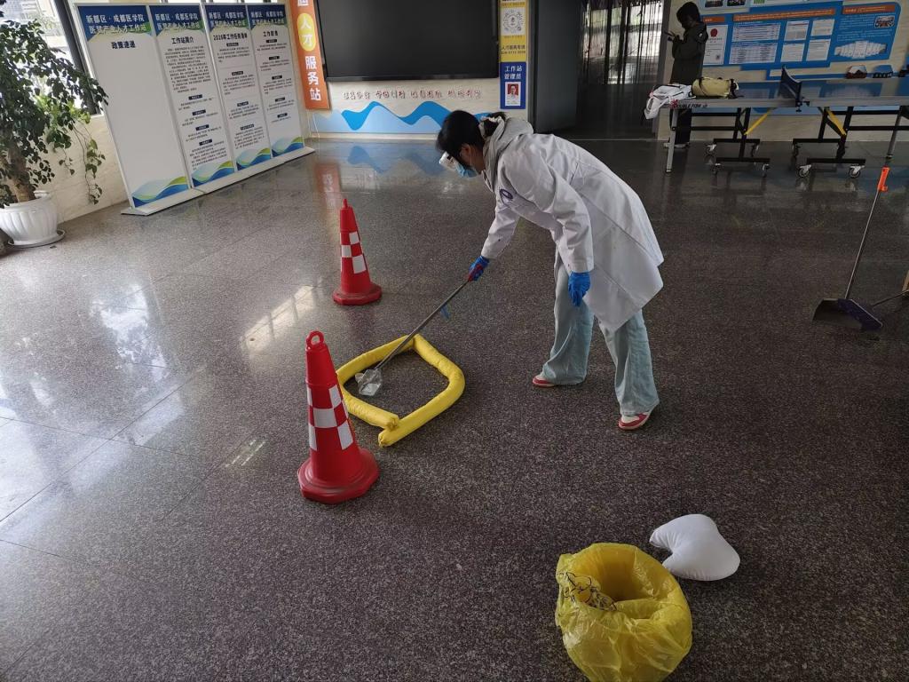 演练模拟“有机试剂泄漏”场景:试剂瓶被打翻后,人员迅速撤离并报告。应急处置小组规范穿戴防护装备,使用吸附棉等工具按“控源-围堵-吸附-清理”流程处置,整个处置过程快速、规范、有序,有效避免了泄漏试剂扩散引发的二次危害。