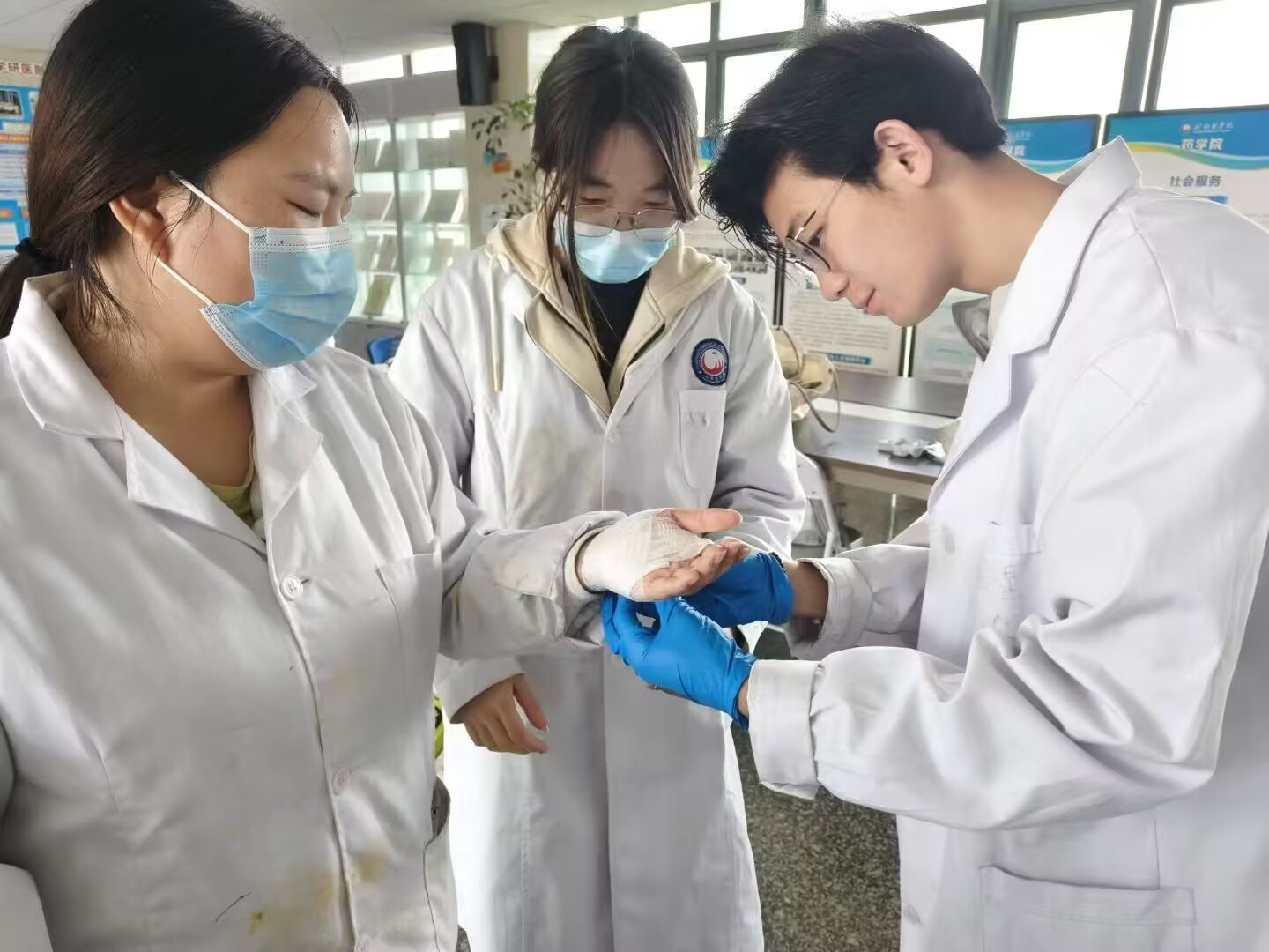 模拟“玻璃器皿划伤”:学生手指被划伤后,自行按压止血并报告。应急处置小组用生理盐水冲洗、碘伏消毒,并包扎伤口,同时做好后续就医提示。