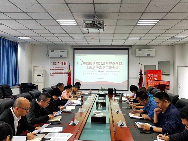 为持续有力推动全面从严治党向纵深发展、向基层延伸,着力营造风清气正良好政治生态和干事创业良好环境,4月27日上午,基础医学院组织召开2026年春季学期全面从严治党工作会议。校党委常委、副校长代敏出席会议。学院全体党委委员、纪委委员、各教研室负责人以及各党支部书记、纪检委员参加会议。