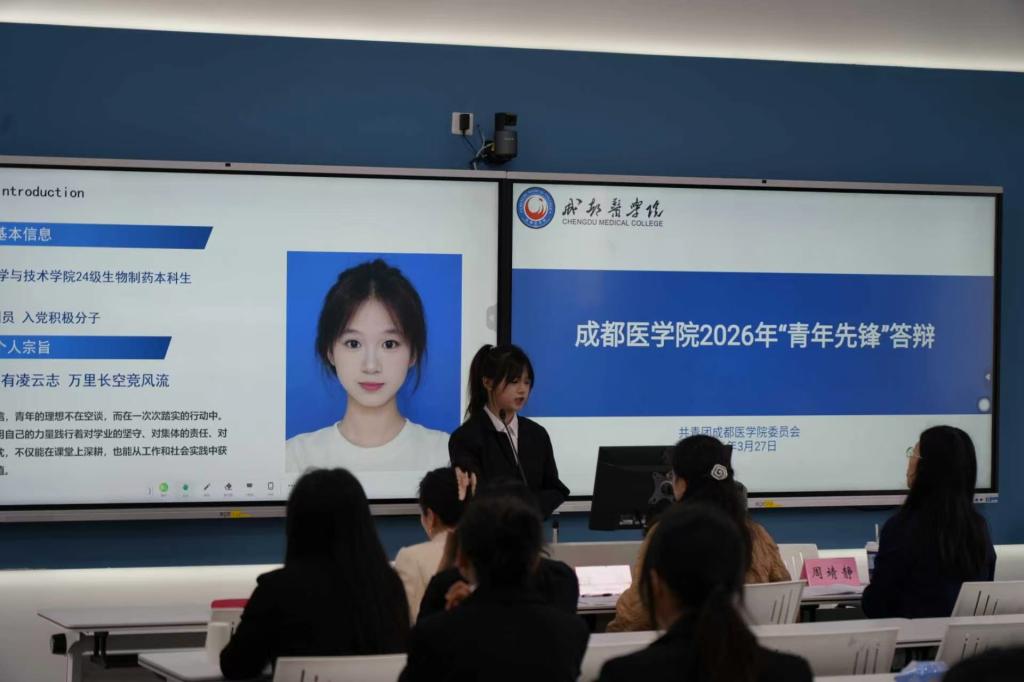 3月27日中午,成都医学院2026年“青年先锋”评选答辩会在教学楼举行。学校分管领导出席会议。经选拔推荐,70余名优秀候选人参加答辩,全面展现成医青年在思想引领、学业科研、社会实践、志愿服务等方面的突出成绩和奋斗故事。