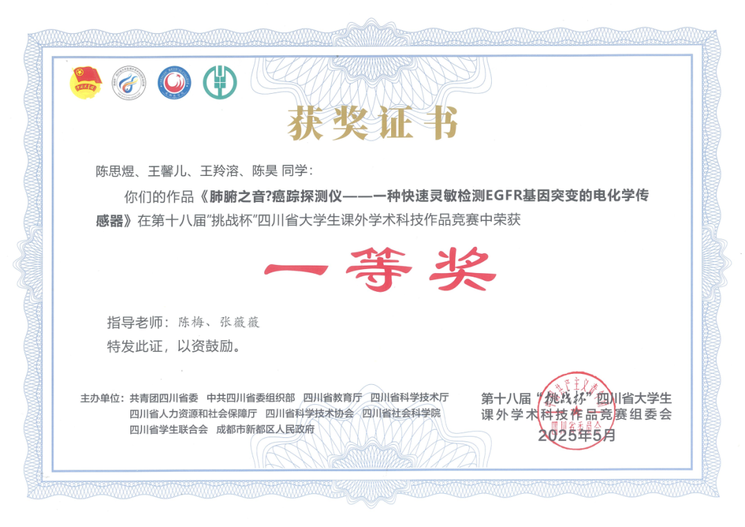 在第十八届“挑战杯”四川省决赛中,我指导的生物制药专业本科生团队表现优异。项目负责人陈思煜同学最初对参赛信心不足。去年十一月,我鼓励她:“这是一个宝贵的锻炼机会,老师相信你!”她最终鼓起勇气,带领团队投入备赛。那段日子,他们挑灯夜战、反复打磨,面对实验数据不佳、方案屡次修改的困难,始终没有退缩。他们查阅文献、请教专家、持续优化,不断突破自我。决赛答辩时,清晰的逻辑、扎实的数据和沉稳的台风,赢得了评委的一致认可——团队一举斩获省一等奖。思煜激动地跑来告诉我:“陈老师,我们做到了!”这份荣誉背后,更是他们将理论转化为实践的能力、团队协作与抗压能力的真实成长。这也正是我们“以赛促学、以研促教”育人理念的生动体现。