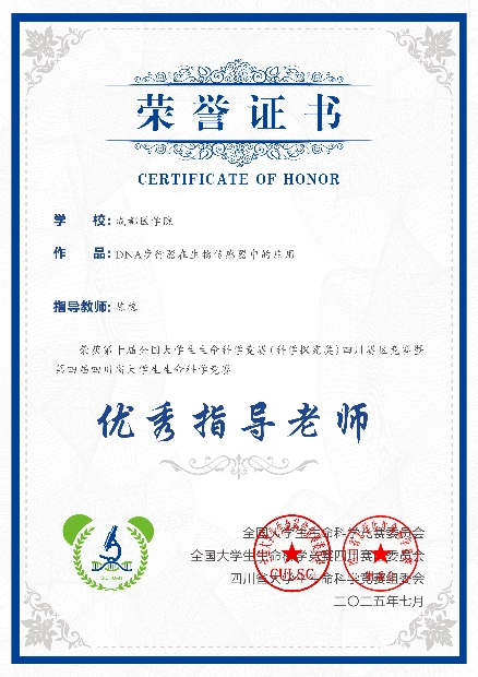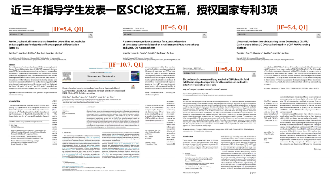 作为硕士研究生导师和首批“成医英才”入选者,我始终秉持科研与育人的双重使命。我指导的首届硕士生郭宏,是以士兵计划录取的,入学成绩虽为专业最低,但她怀揣着强烈的科研热情。初期,面对复杂的实验与数据分析,她一度不知所措。我为她讲述了自己申报国家自然科学基金时的挫折与坚持,以此点燃她的信心。在我的陪伴与指导下,她越发严谨细致,最终不仅攻克了实验难关、发表了高水平SCI论文,更作为负责人成功获批四川省苗子工程项目。见证小郭从迷茫到坚定的蜕变,我倍感欣慰——我传递的不仅是科研方法,更是迎难而上的信念与解决问题的能力。近日,我带领的研究生团队在第十届全国大学生生物医学工程创新设计竞赛中的临床转化赛道(研究生组)中表现卓越,斩获全国二等奖。近三年来,指导的学生共发表一区SCI论文五篇,获授权国家专利三项,这正是我们科研育人实效的生动注脚。