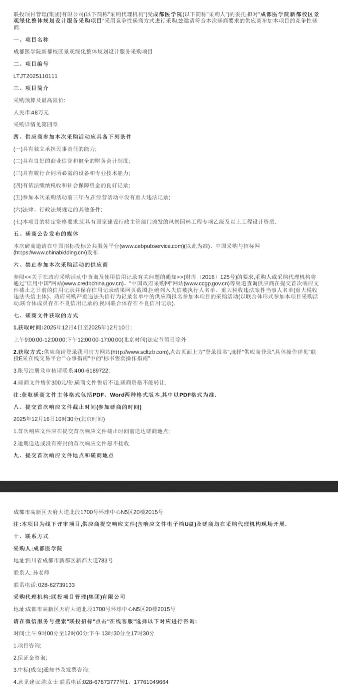 成都医学院新都校区景观绿化整体规划设计服务磋商公告
