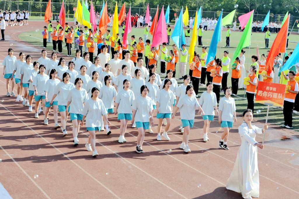 在国旗护卫队的引领下,教职员工、学生、裁判组成的20余个方队,伴随着激昂的音乐,精神抖擞,依次入场。各方队意气风发,行进中各展创意表演,尽显成医师生团结协作、昂扬向上的精神风貌。