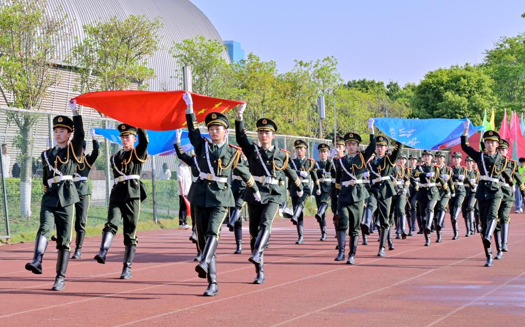 雄壮激昂的国歌响起,全体师生庄严肃立,齐声合唱,慷慨激昂的旋律回荡在运动场的每一个角落,向祖国致以最崇高的敬意。