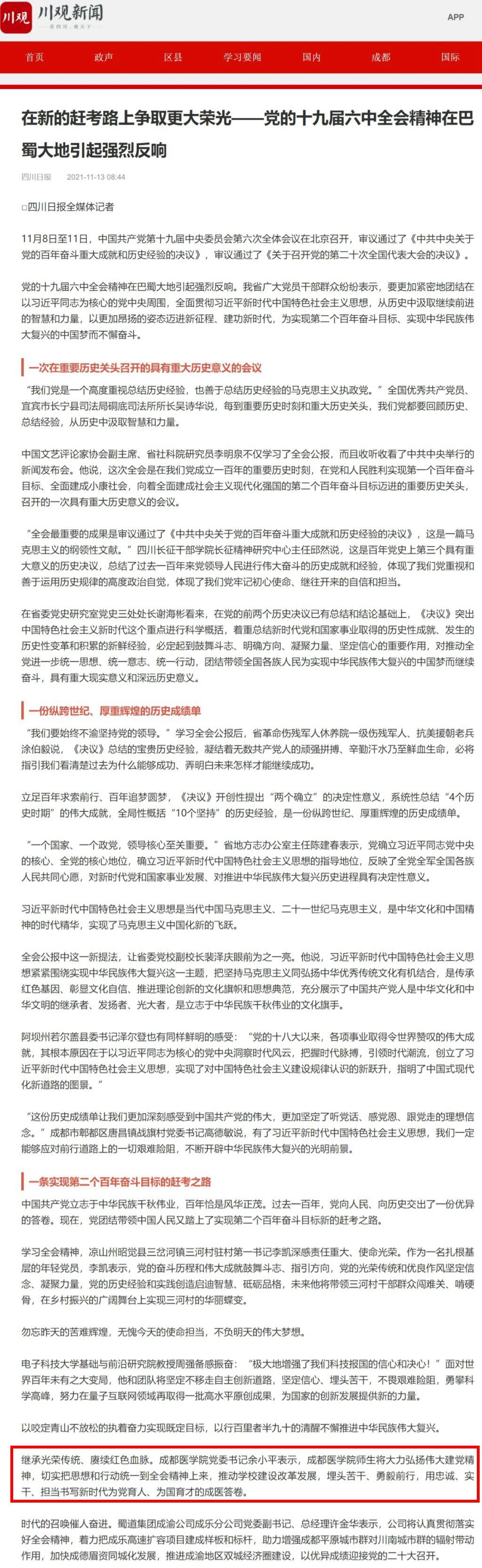 继承光荣传统、赓续红色血脉。成都医学院党委书记余小平表示,成都医学院师生将大力弘扬伟大建党精神,切实把思想和行动统一到全会精神上来,推动学校建设改革发展,埋头苦干、勇毅前行,用忠诚、实干、担当书写新时代为党育人、为国育才的成医答卷。