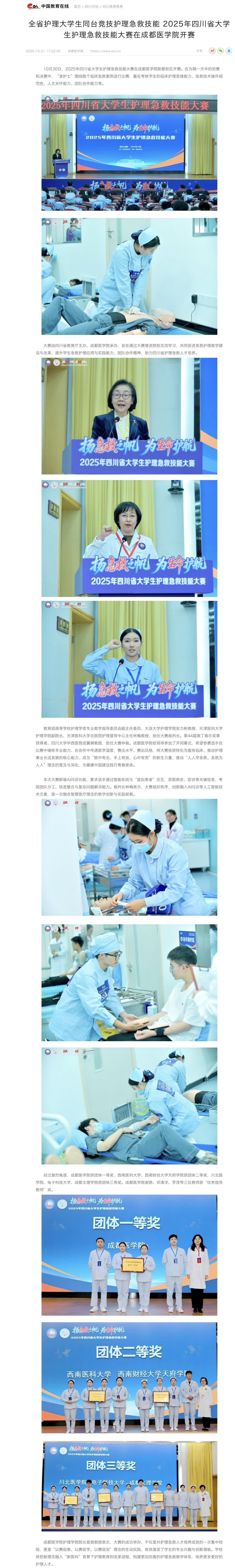 成都医学院护理学院院长曾兢教授表示,大赛的成功举办,不仅是对护理急救人才培养成效的一次集中检验,更是“以赛促教、以赛促学、以赛促改”理念的生动实践,有效激发了学生的专业兴趣与创新潜能。学校将把新理念融入“新医科”背景下护理教育的改革进程,构建更加完善的护理急救教学体系,培养更多更好的护理人才。