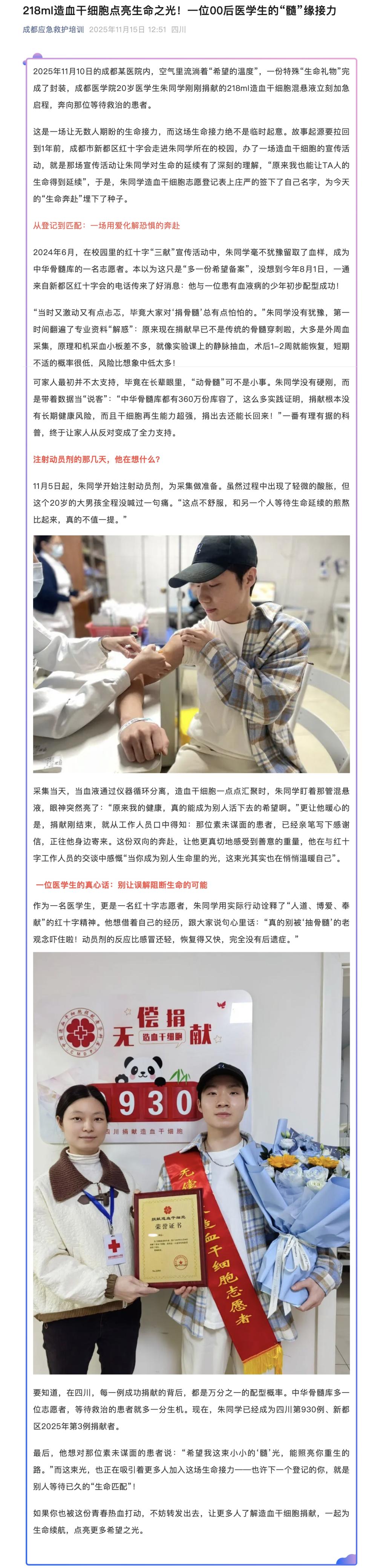 要知道,在四川,每一例成功捐献的背后,都是万分之一的配型概率。中华骨髓库多一位志愿者,等待救治的患者就多一分生机。现在,朱同学已经成为四川第930例、新都区2025年第3例捐献者。