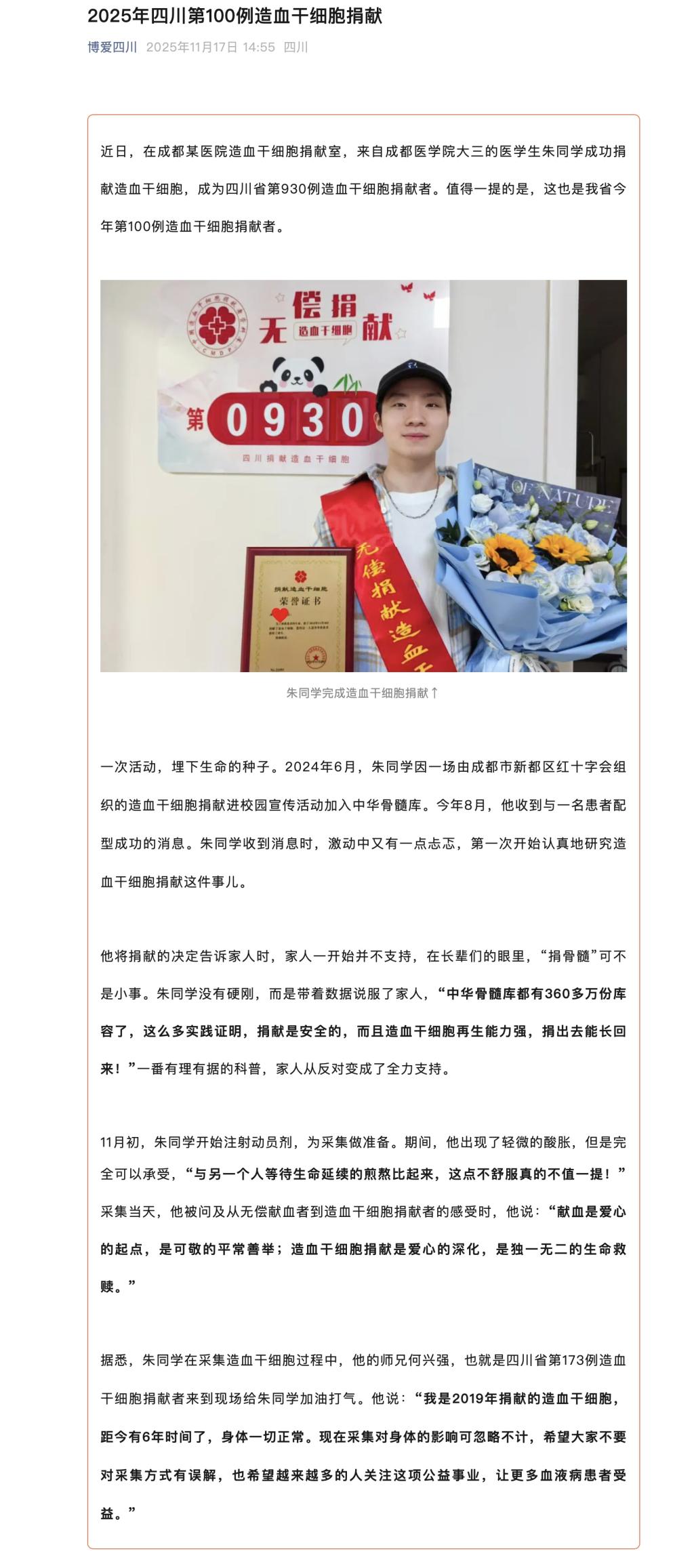 朱同学完成造血干细胞捐献↑