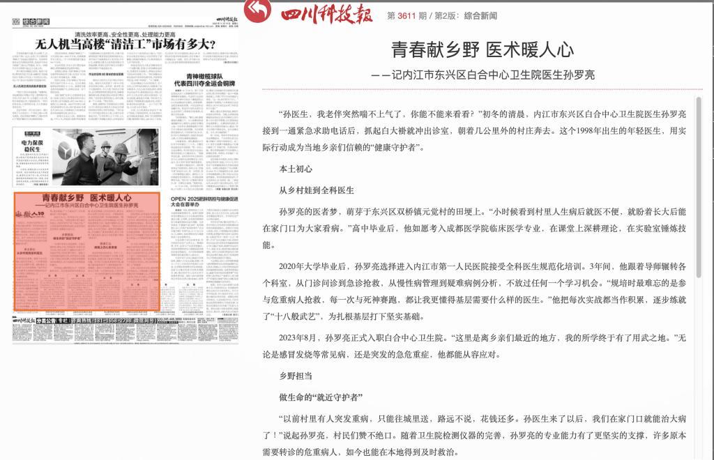 孙罗亮的医者梦,萌芽于东兴区双桥镇元觉村的田埂上。“小时候看到村里人生病后就医不便,就盼着长大后能在家门口为大家看病。”高中毕业后,他如愿考入成都医学院临床医学专业,在课堂上深耕理论,在实验室锤炼技能。