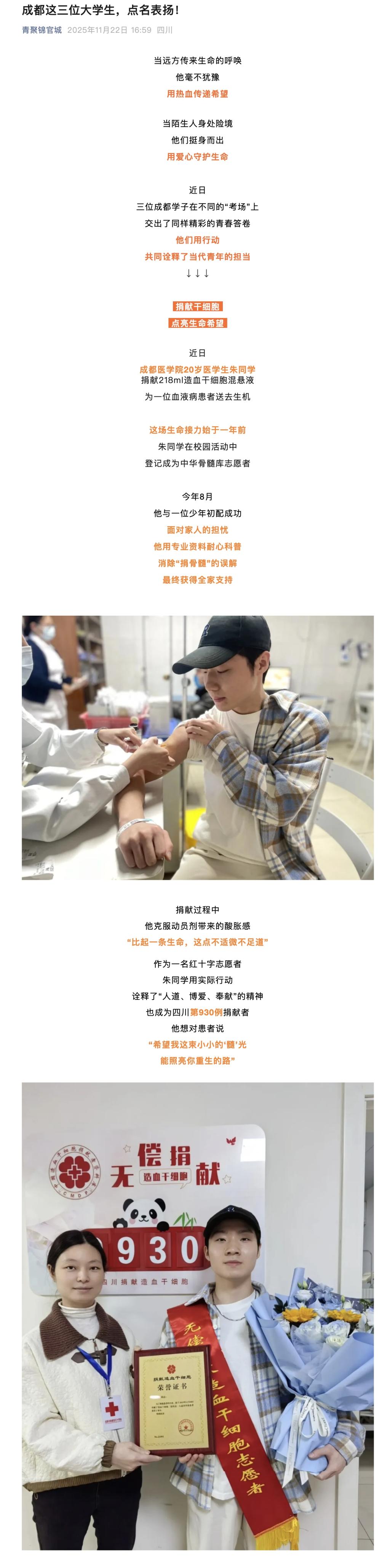 青聚锦官城微信公众号:成都这三位大学生,点名表扬!