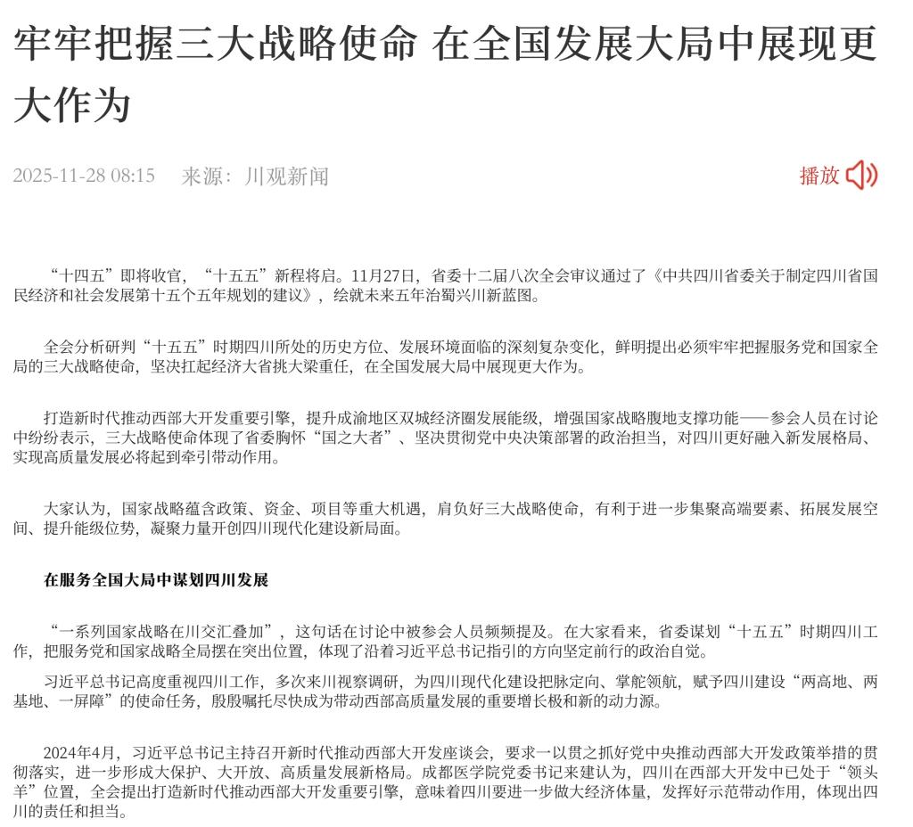“十四五”即将收官,“十五五”新程将启。11月27日,省委十二届八次全会审议通过了《中共四川省委关于制定四川省国民经济和社会发展第十五个五年规划的建议》,绘就未来五年治蜀兴川新蓝图。