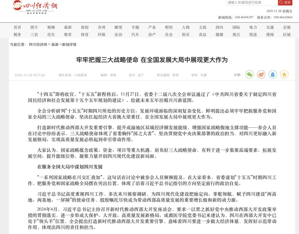 “十四五”即将收官,“十五五”新程将启。11月27日,省委十二届八次全会审议通过了《中共四川省委关于制定四川省国民经济和社会发展第十五个五年规划的建议》,绘就未来五年治蜀兴川新蓝图。