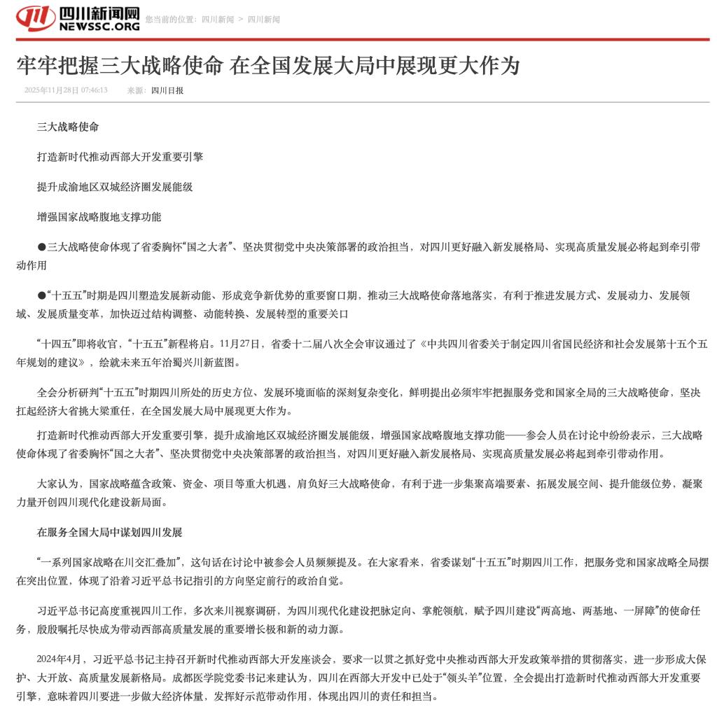 四川新闻网:牢牢把握三大战略使命 在全国发展大局中展现更大作为