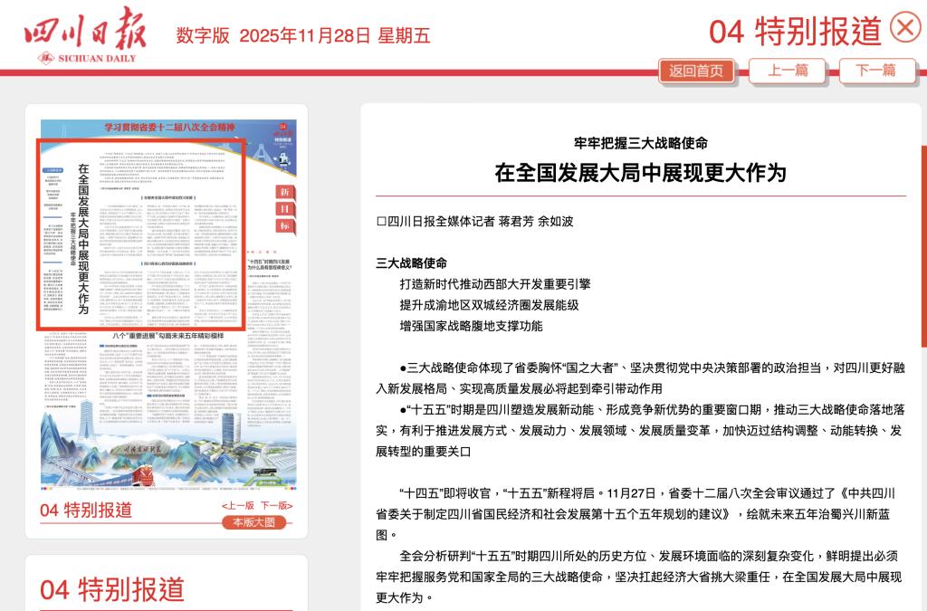 “十四五”即将收官,“十五五”新程将启。11月27日,省委十二届八次全会审议通过了《中共四川省委关于制定四川省国民经济和社会发展第十五个五年规划的建议》,绘就未来五年治蜀兴川新蓝图。