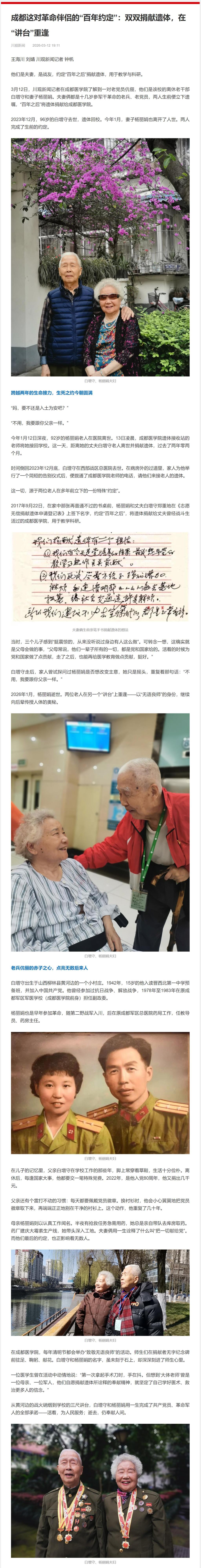 3月12日,川观新闻记者在成都医学院了解到一对老党员伉俪,他们是该校的离休老干部白增守和妻子杨丽娟。夫妻俩都是十几岁参军干革命的老兵、老党员,两人生前便立下遗嘱,“百年之后”将遗体捐献给成都医学院。