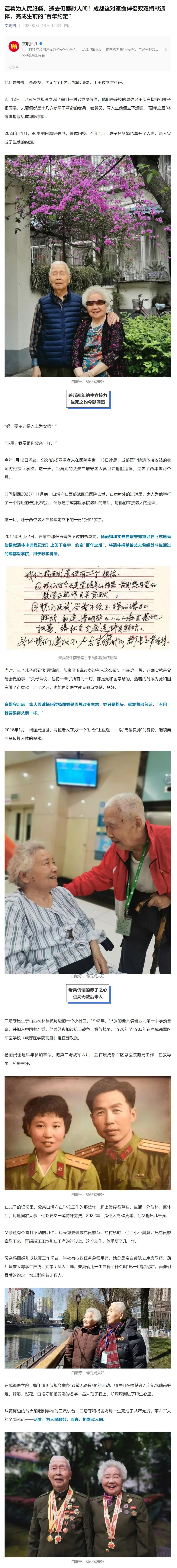 文明四川微信公众号:活着为人民服务,逝去仍奉献人间!成都这对革命伴侣双双捐献遗体,完成生前的“百年约定”