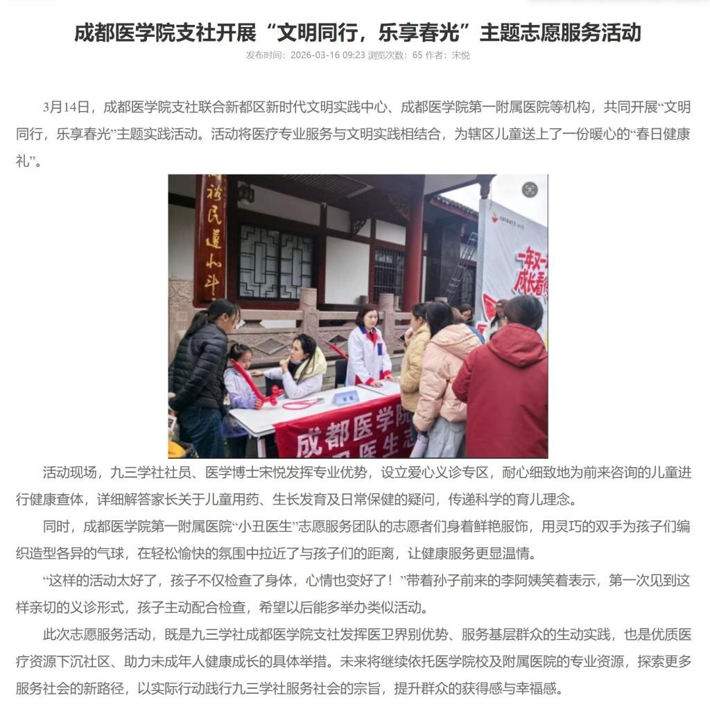 此次志愿服务活动,既是九三学社成都医学院支社发挥医卫界别优势、服务基层群众的生动实践,也是优质医疗资源下沉社区、助力未成年人健康成长的具体举措。未来将继续依托医学院校及附属医院的专业资源,探索更多服务社会的新路径,以实际行动践行九三学社服务社会的宗旨,提升群众的获得感与幸福感。