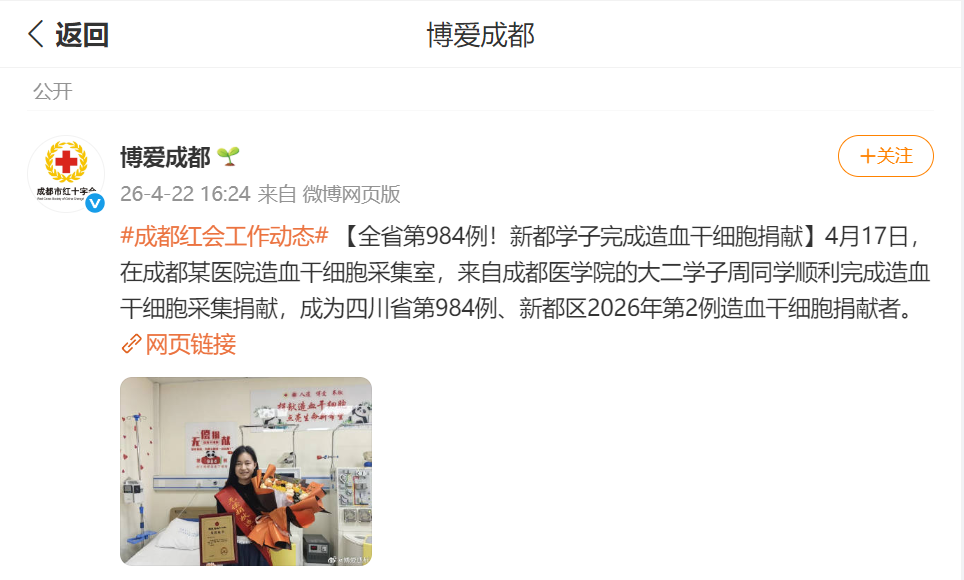 #成都红会工作动态#【全省第984例!新都学子完成造血干细胞捐献】4月17日,在成都某医院造血干细胞采集室,来自成都医学院的大二学子周同学顺利完成造血干细胞采集捐献,成为四川省第984例、新都区2026年第2例造血干细胞捐献者。