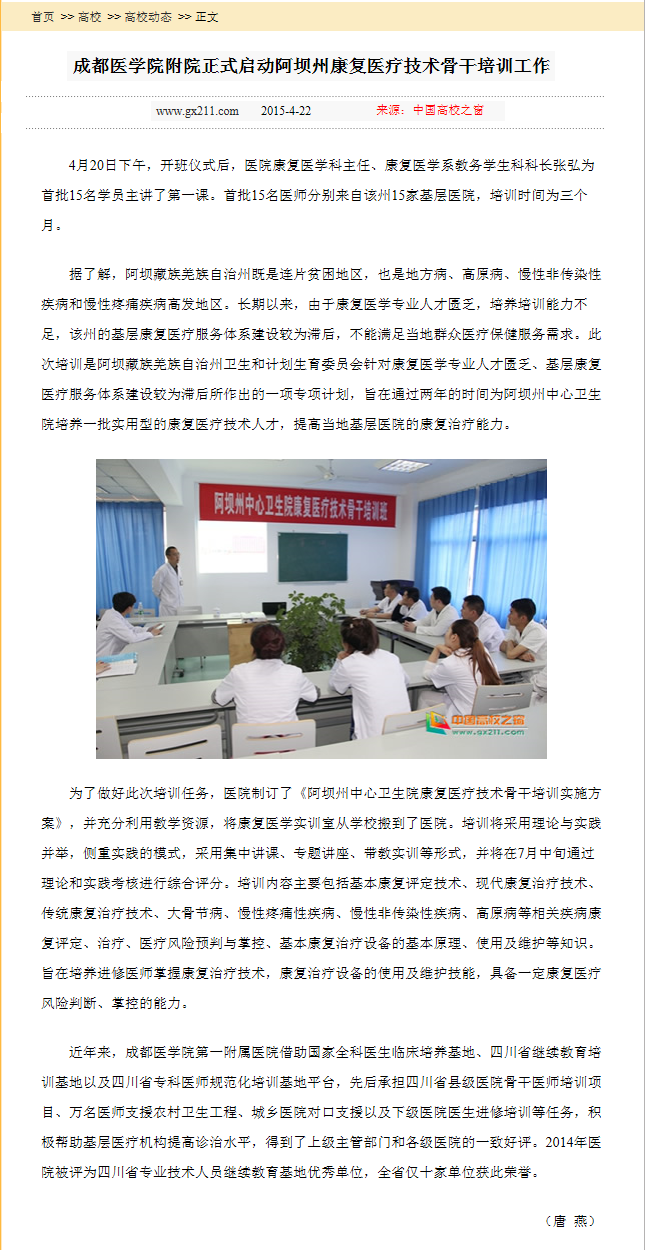 据了解,阿坝藏族羌族自治州既是连片贫困地区,也是地方病、高原病、慢性非传染性疾病和慢性疼痛疾病高发地区。长期以来,由于康复医学专业人才匮乏,培养培训能力不足,该州的基层康复医疗服务体系建设较为滞后,不能满足当地群众医疗保健服务需求。此次培训是阿坝藏族羌族自治州卫生和计划生育委员会针对康复医学专业人才匮乏、基层康复医疗服务体系建设较为滞后所作出的一项专项计划,旨在通过两年的时间为阿坝州中心卫生院培养一批实用型的康复医疗技术人才,提高当地基层医院的康复治疗能力。