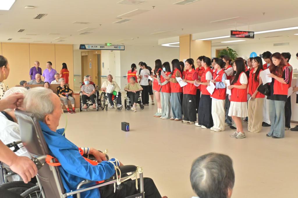团队分别前往医院内分泌科、安宁疗护科和心血管内科病房。志愿者献上《明天会更好》等经典合唱,熟悉的旋律勾起老人美好的记忆,不少人轻声跟唱。志愿者带领老人一起完成手指操,一对一引导老人“张指——握拳”,助力其促进血液循环、延缓大脑衰老。