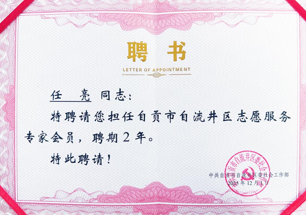 12月1日,在自贡市自流井区2025年度“12·5”国际志愿者日主题活动中,成都医学院校团委任亮老师受聘为该区志愿服务专家库专家,将为区域志愿服务专业化、规范化发展注入高校的智慧与力量。